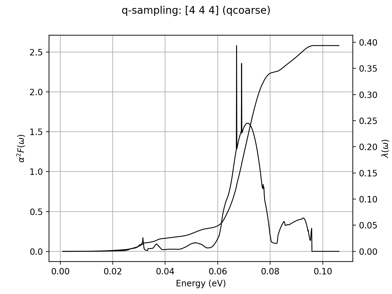 The technique used to compute \alpha^2F(\ww) is defined by ph_intmeth (note the ph_ prefix instead of eph_). Both the Gaussian (ph_intmeth = 1 with ph_smear smearing) and the linear tetrahedron method by [Blochl1994] (ph_intmeth = 2, default) are implemented. The \alpha^2F(\ww) function is evaluated on a linear mesh of step ph_wstep covering the entire range of phonon frequencies. The total e-ph coupling strength \lambda (a dimensionless measure of the average strength of the e-ph coupling) is defined as the first inverse moment of \alpha^2F(\ww):