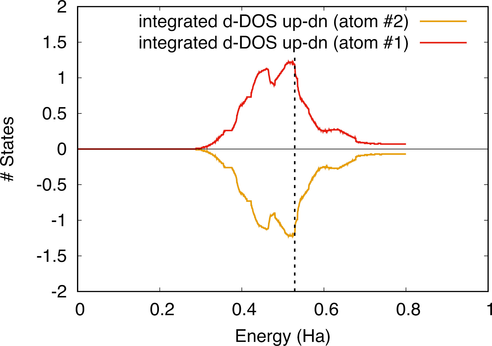 We observe that the up and down DOS channels have been “shifted” with respect to each other, which is a footprint of the presence of non-zero total magnetization in the crystal (either ferro- or ferri-magnetic). The integrated DOS yields the number of electrons for each spin direction, and we see that the magnetization arises from the fact that there are more up than down electrons at the Fermi level.